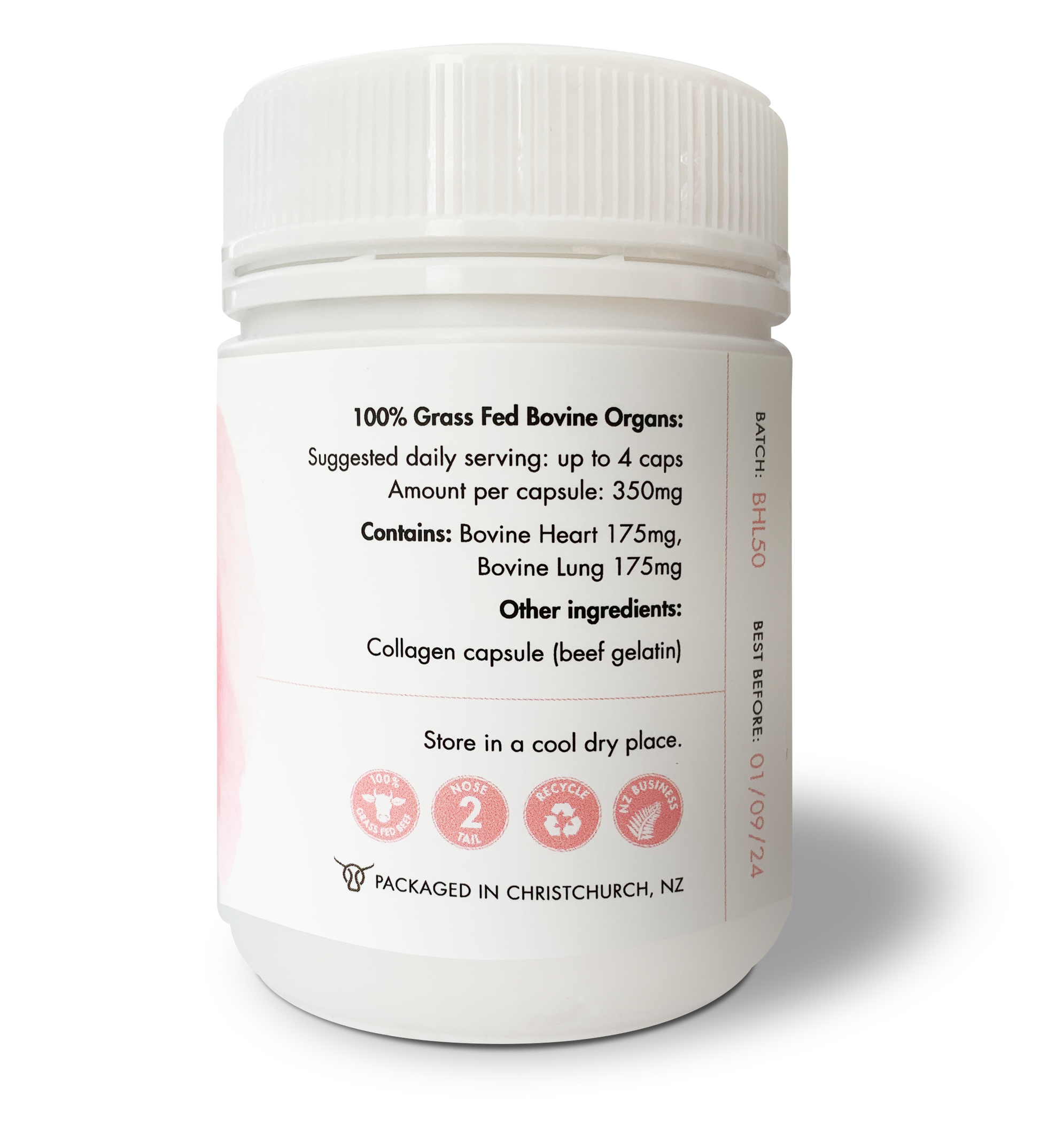 This natural 2-organ blend provides nutrient-rich bovine organs that help support heart and respiratory health, and active lifestyles. Each capsules combines wholefood nutrients from New Zealand grass-fed cattle delivering a balanced source of CoQ10, B vitamins, and iron to support normal energy metabolism, cardiovascular health, normal oxygen delivery and overall health and activity.